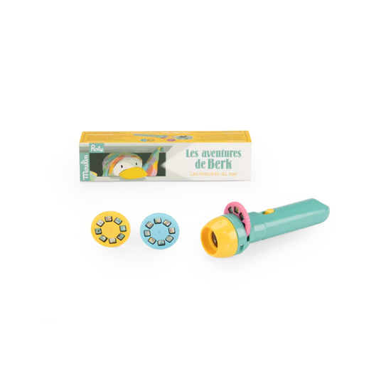 Linterna de historias con 3 discos para proyectar y contar historias en color sin guión de Berk, el patito intrépido y torpe. En colaboración con la editorial infantil École des loisirs. Autor e ilustrador: Julien Béziat.